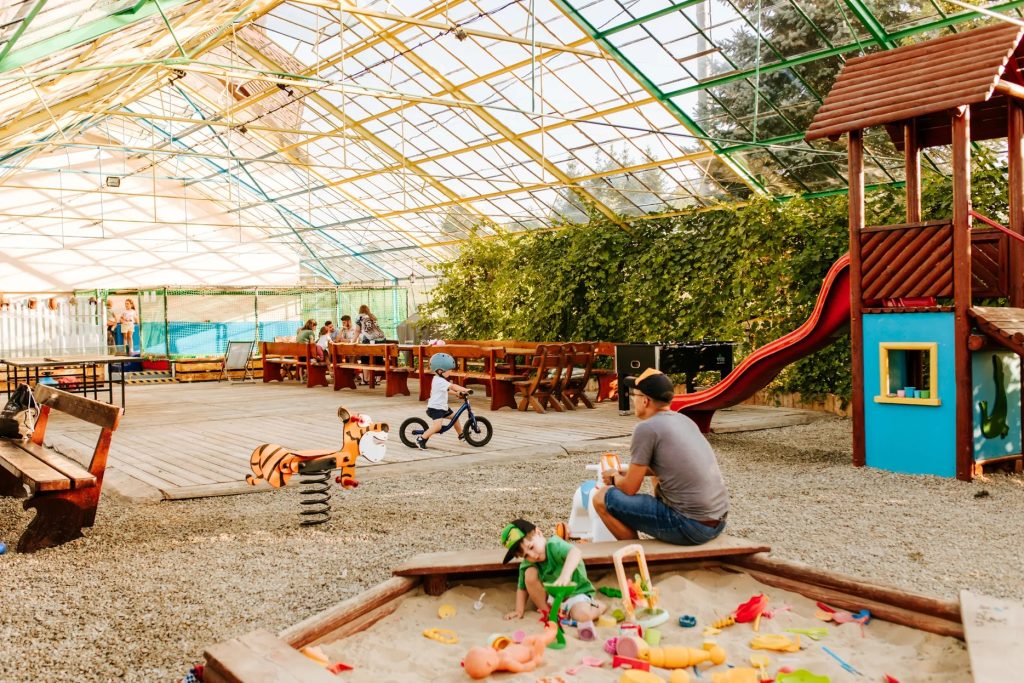 Dla dzieci to po prostu dobre miejsce do bycia dzieckiem. Duża łąka zachęca do biegania, a plac zabaw tuż obok daje zajęcie także wtedy, gdy pogoda nie dopisuje. Wieczorami dzieci mogą sięgnąć po gry z projektora albo książeczki, a rodzice mają chwilę dla siebie. To miejsce dla rodzin, które szukają spokoju, przestrzeni i wakacji bez planowania każdej godziny.