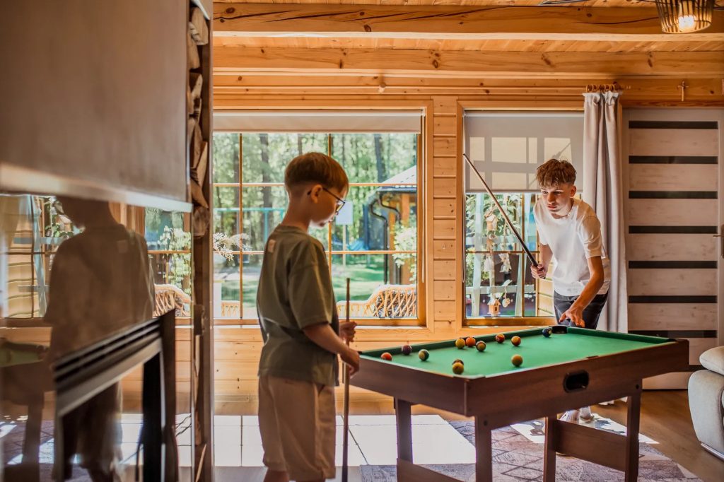 Dla dzieci to przestrzeń do swobodnej zabawy — w domu i na zewnątrz. Duży pokój gier pozwala im się wyszaleć, nawet gdy pogoda nie sprzyja, a ogród, staw i okolica zachęcają do ruchu i odkrywania. Dorośli doceniają wygodę domu, naturalne wnętrza i możliwość spokojnych wieczorów — przy rozmowie, grze albo ognisku. Edkovy Ray sprzyja prostym, wspólnym momentom, które często zostają w pamięci na dłużej niż same atrakcje.